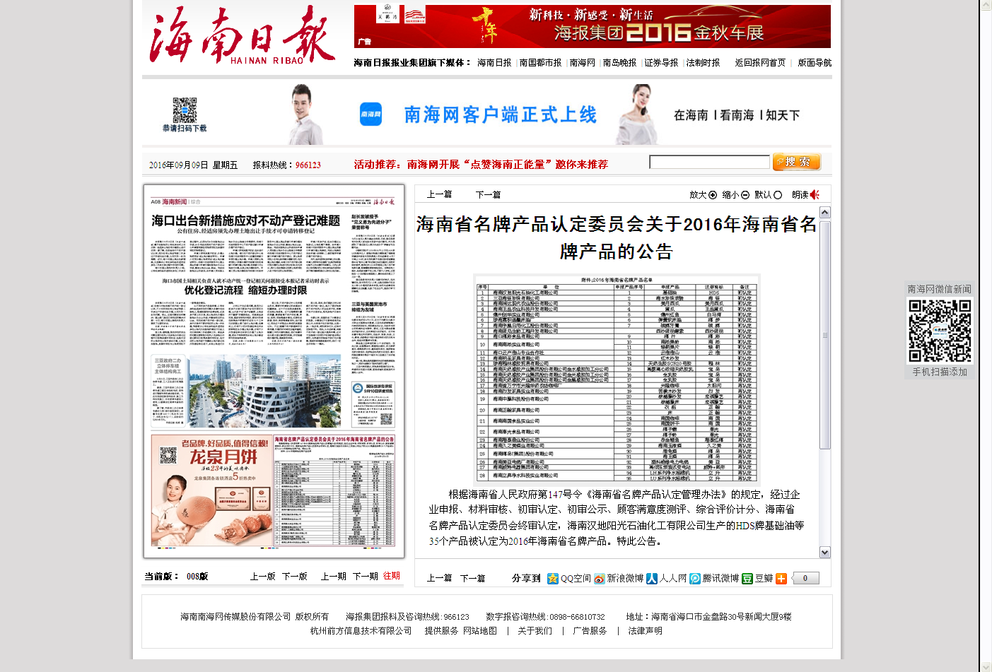 海南省名牌產(chǎn)品認(rèn)定委員會(huì)在2016年9月9日的海南日?qǐng)?bào)上公布了被認(rèn)定為“2016年海南省名牌產(chǎn)品”的28家企業(yè)的35個(gè)產(chǎn)品,海南久之美酒業(yè)有限公司出品的“海南玉液酒”名列其中。 當(dāng)日公告如下: