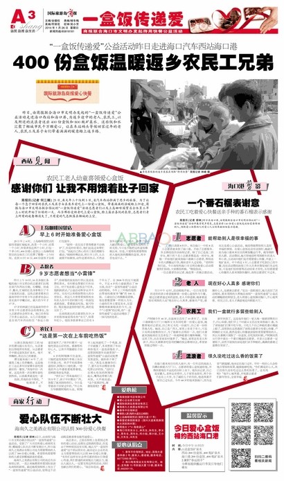 高總表示,之前在報(bào)紙上也看到過(guò)類(lèi)似的愛(ài)心活動(dòng),還萌生過(guò)捐酒的想發(fā).但是由于種種原因沒(méi)有實(shí)現(xiàn),她認(rèn)為"一盒飯傳遞愛(ài)"這個(gè)倡議很實(shí)在,就決定以企業(yè)的名義為需要幫助的人認(rèn)捐300份愛(ài)心快餐."有你們這樣有社會(huì)責(zé)任感的報(bào)社引領(lǐng)愛(ài)心傳遞,我們普通的商家能出力就出力,能出人就出人,一定要支持這樣的活動(dòng),同時(shí)也獻(xiàn)出我們的愛(ài)心."高總?cè)缡钦f(shuō).