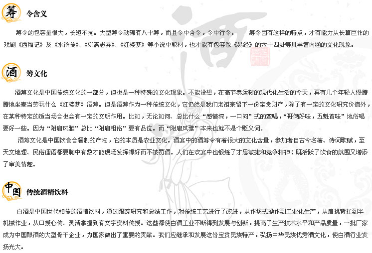 | “杯小乾坤大,壺中日月長(zhǎng)”,無論怎樣,人在社會(huì)生活中都要直接或間接地與酒搭上關(guān)系。這種關(guān)系的物化表現(xiàn)就是酒趣。酒趣富于酒令之中,酒令則純是以文化入酒的,是酒文化中的文化精粹。 早在兩千多年前的春秋戰(zhàn)國時(shí)代,酒令就在黃河流域的宴席上出現(xiàn)了。酒令分俗令和雅令。猜拳是俗令的代表,雅令即文字令,通常是在具有較豐富文化知識(shí)的人士間流行。白居易曰:“閑徵雅令窮經(jīng)吏,醉聽新吟勝管弦。”認(rèn)為酒宴中的雅令要比樂曲佐酒更有意趣。文字令又包括字詞令、謎語令、籌令等。 |